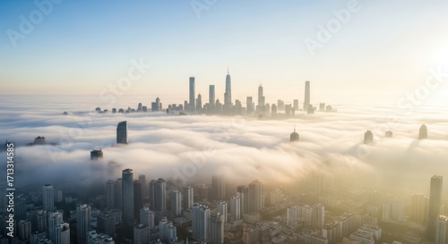 Urban dreamscape aerial view of skyscrapers piercing through blanket of morning fog