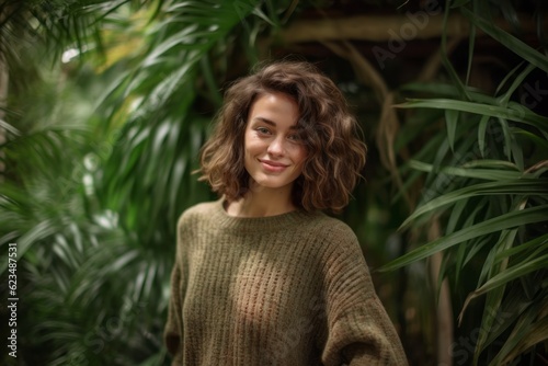 Urban fashion portrait photography of a grinning girl in her 30s wearing a cozy sweater against a lush tropical jungle background. With generative AI technology