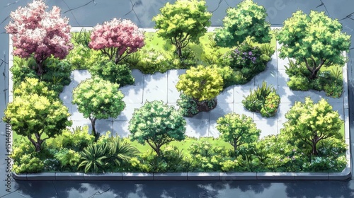 garden, urban, landscape, tree, plant, greenery, design, view, illustration, flower, shrub, bush, foliage, nature, spring, summer, botany, horticulture, park, courtyard, vegetation, environment, ecology, biodiversity, ecosystem, scenery, outdoors, natural, aesthetic, artwork, artistry, vibrant, colourful, peaceful, tranquil, serene, calm, relaxing, refreshing, restorative, comforting, soothing, beautiful, pretty, lovely, charming, picturesque