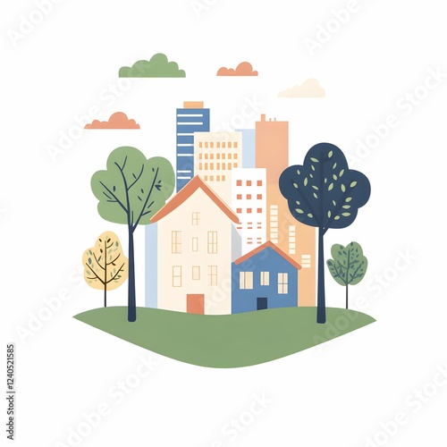 Urban Harmony: Houses and Skyscrapers Coexist with Nature in a Balanced Cityscape Illustration. Balanced Urbanity: Playful Illustration of Homes and Nature Nestled Within a Bustling City Skyline