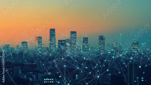 Urban landscape at dusk with neon lines and dots showcasing Generative AI's influence