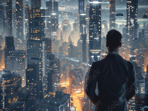 Urban landscape with towering buildings and bustling streets under the stars
