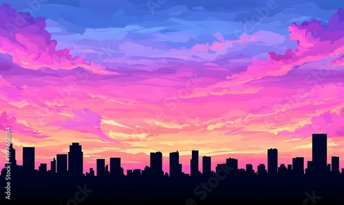 Urban Silhouette at Dusk, a city skyline emerges against a vibrant sky, hues of orange and purple blending into twilight, evoking serenity.
