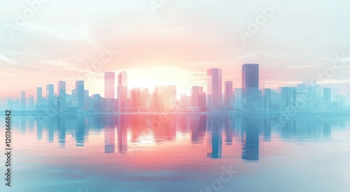 Urban skyline at sunrise with reflective water surface, showcasing a stunning blend of colors in a cityscape, ideal for vibrant backgrounds and artistic compositions.