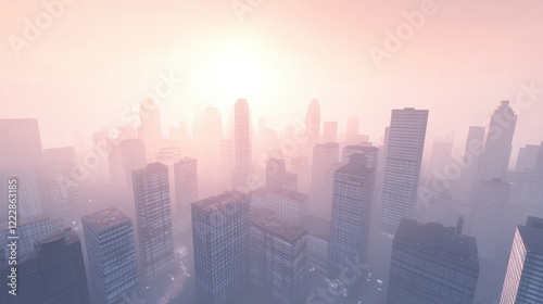 Urban skyline shrouded in smog, hazy atmosphere, 3D illustration.