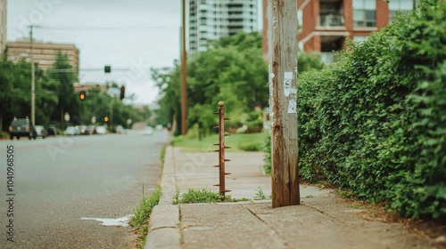 street, utility pole, sidewalk, urban, greenery, traffic light, concrete, city, nature, weed, landscape, roadside, path, pole, rural, environment, growth, infrastructure, architecture, city landscape, transportation, road, asphalt, setting, summer, residential, horizon, design, detail, calmness, lifestyle, street art, pavement, solitude, city life, natural light, community, empty, quiet, scene, perspective, contrast, surrounding, faded, weathered
