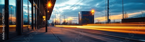 Urban Sunset: Cityscape at Dusk with Light Trails
