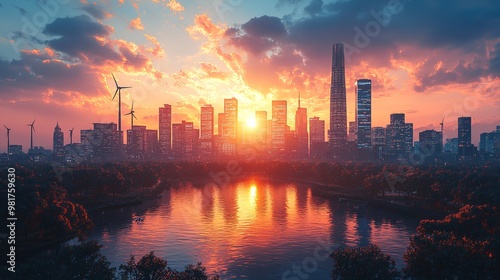 city, sunset, skyline, river, cloud, windmill, light, water, nature, urban
