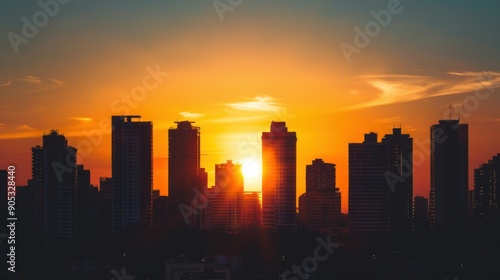 Urban Sunset Silhouette: City Buildings with Sun Setting Behind Creating Dramatic Skyline View at Dusk