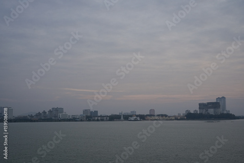 urban waterfront city skyline with overcast sky at dawn in singapore
