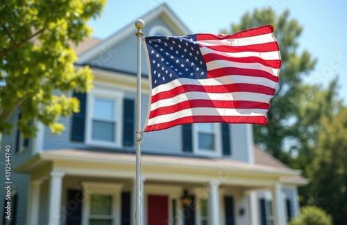 US flag waves proudly in front of American house against sky. Patriotism, national identity, freedom, independence. Represents unity, love for country. Sunny day, beautiful neighborhood with green