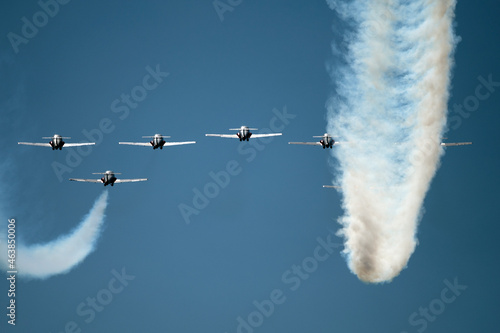 sky, plane, air, aeroplane, smoke, jet, fly, flying, air show, cloud, trail, aircraft, cloud, flight, blue, aviation, show, formation, white, vapour, team, high, aerobatic, nature, trail