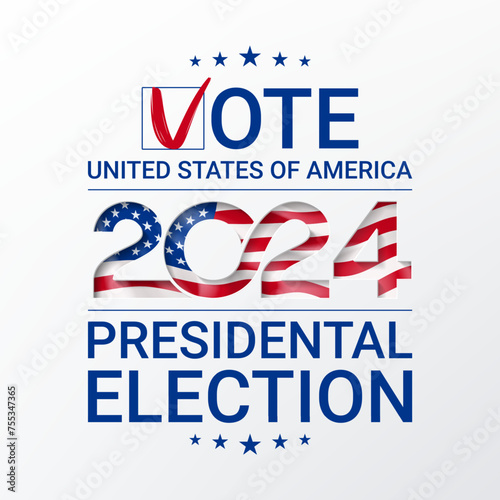 US presidential election 2024 symbol. Template of typography symbol of USA election voting. Vector illustration. US Election 2024 campaign. Vote day, November 5. Paper cutout effect with USA flag.