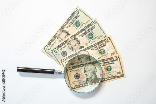 US ten Dollar banknotes under magnifying glass