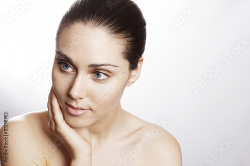 portrait, brown hair, blue eye, studio shot, day, half face, white background, calmness, hygiene, beauty, freshness, us, naked, woman, horizontal, looking away, one person, studio, studio shot, afternoon, daylight, daytime, glance, glancing, head shot, 20s, 20s, youngster, female, young adult, 20 years, missy, single person, portrait, brunette, auburn, auburn hair, brunette, woman, lady, lady