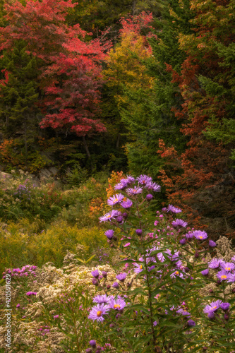 USA, New York, Adirondack State Park. Meadow flowers and forest in autumn.