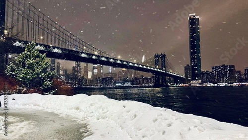 USA New York Bridge Under Winter Snow Storm at Night - Brooklyn Side View