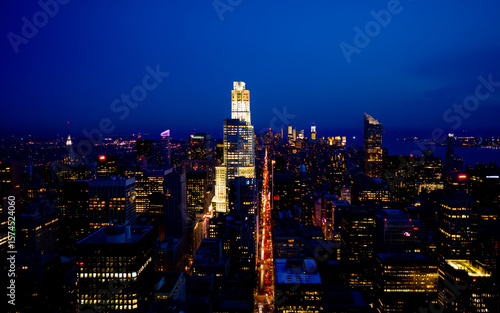 USA, New York City, New York, Manhattan, Aerial view of illuminated skyline at night.