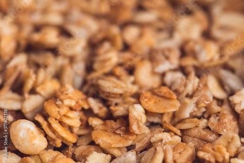 Useful and tasty muesli with nuts, rasins and flakes. Selective focus macro shot with very shallow depth of field. Healthy and vegetarian lifestyle
