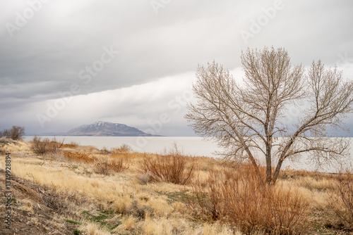 Utah Lake, Vineyard Beach bare tree in dry golden field overlooking lake with cloudy sky and distant snow-covered mountain island in March