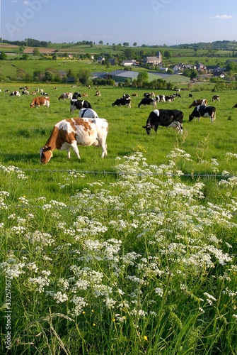 Vaches laitières au pré de différentes races après la traite