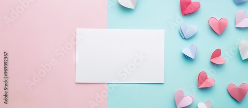 Valentine background concept featuring a top view of a blank white greeting card alongside colorful paper hearts arranged on a pink and light blue backdrop representing invitation and greeting card t