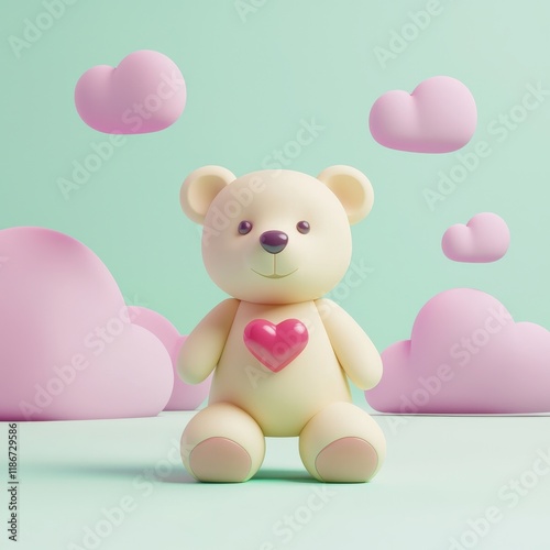 Valentine bear with romance and joy idea. Cute teddy bear with heart among pastel clouds.
