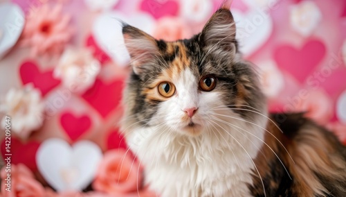 Valentine cat with romance and joy idea. Cute kitten surrounded by heart-shaped decorations.