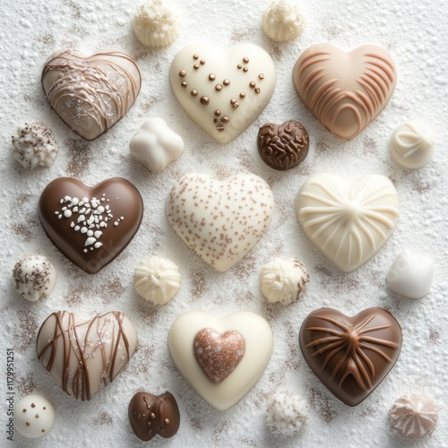 Valentine Chocolate Collection. Luxury heart-shaped chocolates and truffles with various decorative patterns on white powdered surface.