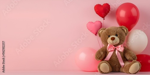 Valentine's Day Banner teddy concept. Teddy bear surrounded by heart balloons on a pink background, perfect for Valentine's Day themes.