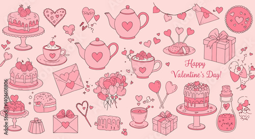 february 14, heart, love, doodle, illustration, pink, cute, romantic, sweet, cake, teapot, gift, cookie, sweet, candy, dessert, teacup, strawberry, balloon, letter, envelope, design element, festive, celebration, holiday