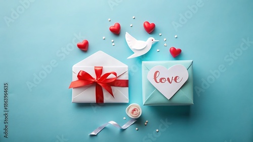 valentine, gift, box, nubes, love, red, ribbon, blue, background, envelope, dove, rose, celebration, present, holiday, decor, paper, bow, romantic, festive, card