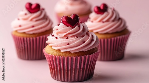 Valentine's Day greeting card featuring sweet homemade pink red cupcakes decorated with hearts and love symbols The cupcakes sit elegantly on a solid pastel pink background
