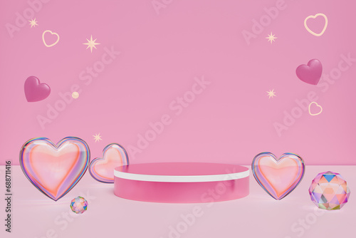 Valentine's day mother's day birthday. Podium with glass hearts. 3d rendering