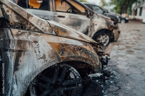 Vandalism or revenge, burnt car. The consequences of popular protest, burnt car, a crime. Car after fire. Auto trash