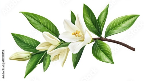 Vanilla pods and delicate flowers with fresh green leaves on a white backdrop.