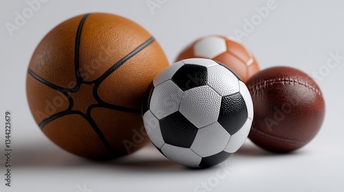 Varied sports ball assortment displaying textures and forms on light backdrop