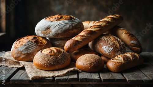Variety of baked bread and bread rolls on wooden table backdrop.