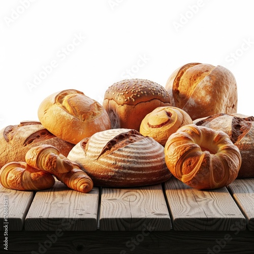 bread, pastry, food, baked, bakery, table, wooden, fresh, delicious, sweet, wheat, crust, rustic, artisan, grain, brown, gold, dough, flour, breakfast, lunch, dinner, snack, meal, still, life, close, up, epicure, culinary, ingredient, sugar, powdered, croissant, loaf, pile, arrangement, display, presentation, white, background, studio, shot, isolated, nourishment, carbohydrate, calorie