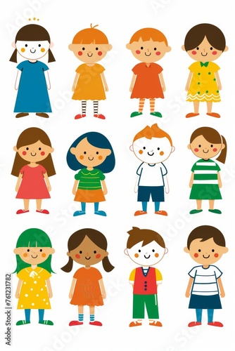 Variety of cartoon vector children in colorful outfits. A diverse group of cartoon children standing in row wearing various colorful outfits representing different styles and personalities