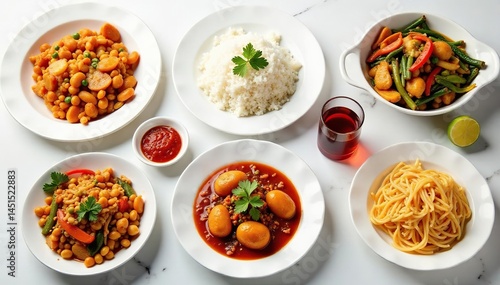 Variety of Chinese dishes on white background, fresh, food photography, dinner