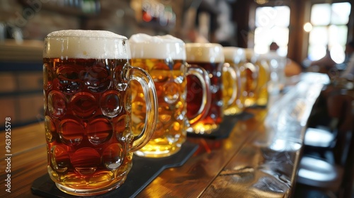 Variety of Craft Beers in Chilled Mugs on Rustic Bar Counter