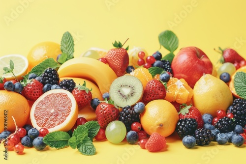 Variety of fresh colorful fruits and berries lying on yellow background