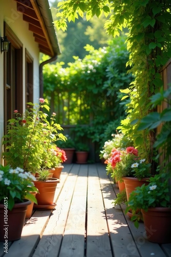 Variety of potted plants adding color to a sun-drenched wooden terrace, spring, beauty