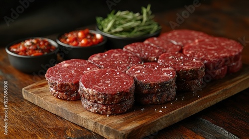 Variety of raw cuts of meat, dry aged beef steaks and hamburger patties