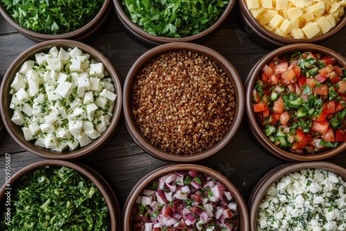 Variety of salads green freekeh Greek chicken cheese bread and white wood