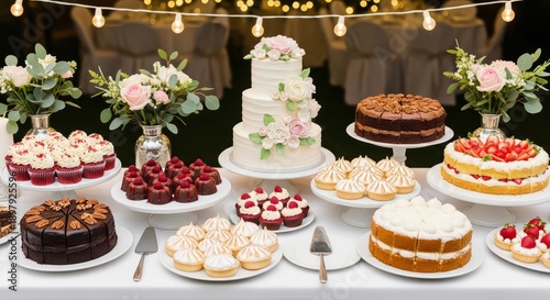 Variety of sweet treats on a dessert table with cakes pastries and flowers for a wedding reception or party celebration