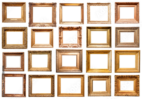 photo frame, picture frame, frame, blank, empty, set, wooden, gold, photo frame, photo, white, white background, isolated, cut-out, cut-out, object, retro, vintage, old, used, brown, collage, collection, various, lot, different, many, rectangular, horizontal, wide, baroque, classic, carved, square