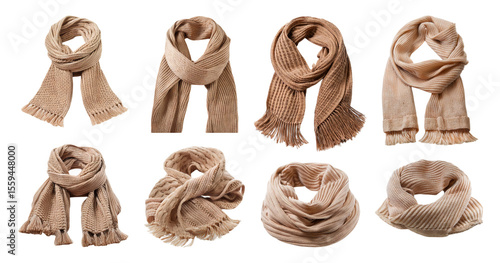 Various Beige Scarves Collection on White Background for Fashion Use, isolated on transparent background