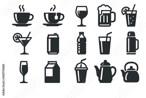 beverage, icon, drink, black, white, hot drink, tea, soda, cocktail, beer, wine, water, bottle, glasses, cup, mug, thermos, cardbox, straw, hot, cold, refreshment, container, outline, symbol, minimalist, simple, graphic, illustration, vector, icon